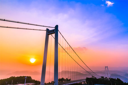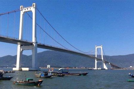 越南峴港順福大橋?yàn)槿邕B續(xù)鋼箱加勁梁懸索橋,主跨405米、全長(zhǎng)1856米,...