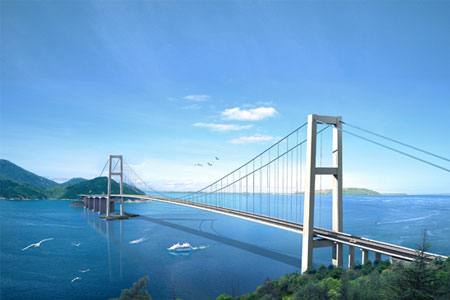 浙江岱山縣秀山大橋?yàn)槿L(zhǎng)3063米,主橋?yàn)榭鐝?26米的雙塔鋼箱梁懸索橋,按雙向...