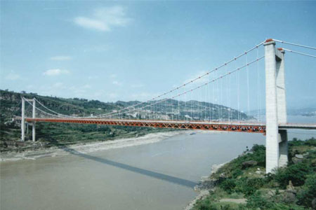 重慶豐都長(zhǎng)江大橋總長(zhǎng)620米,主跨450米,橋?qū)?5米,橋型為鋼筋砼結(jié)合梁...