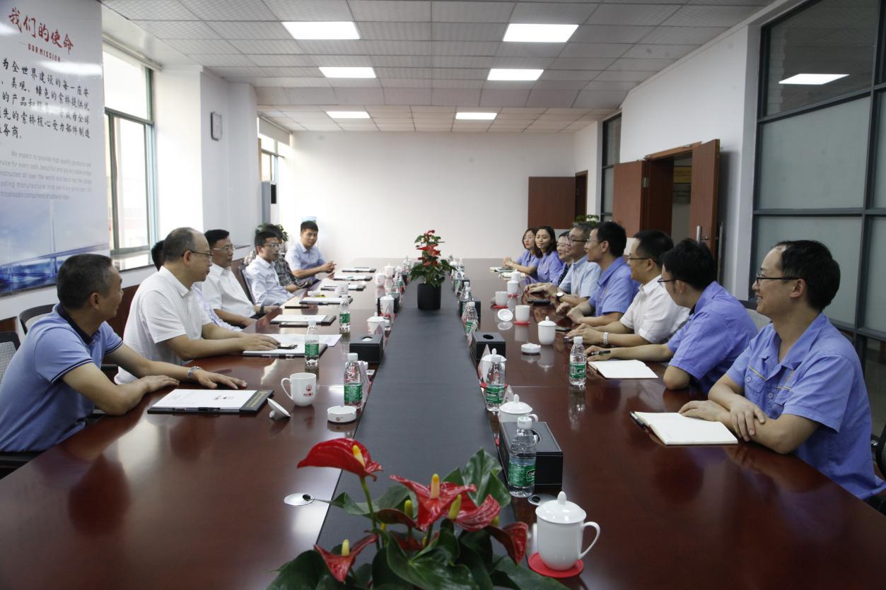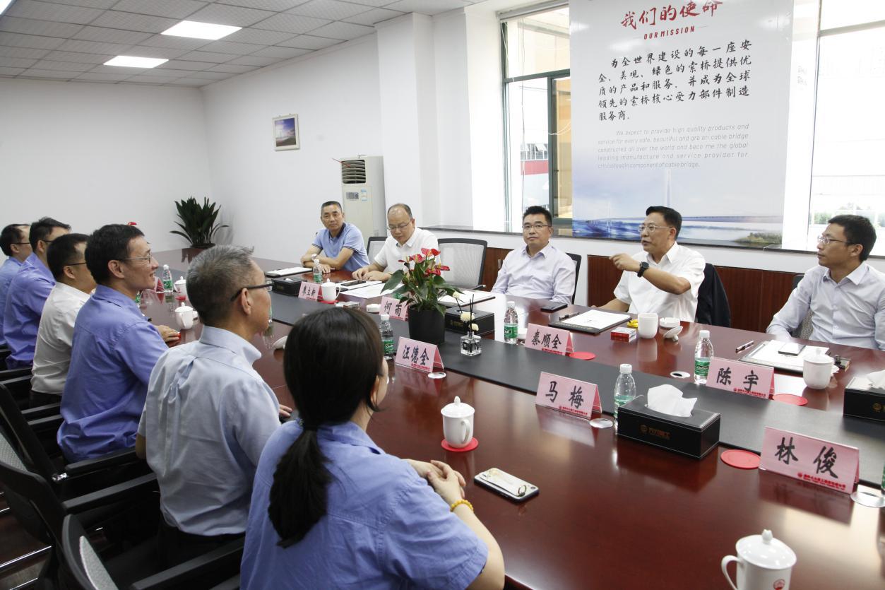 隨后,秦院士及各位領(lǐng)導(dǎo)在公司董事長的陪同下來到公司四樓會(huì)議室進(jìn)行了座談交流,座談會(huì)上,唐明董事長從公司的發(fā)展歷程、企業(yè)科研投入、技術(shù)研發(fā)創(chuàng)新情況、專業(yè)化工藝技術(shù)能力及生產(chǎn)制造能力建設(shè)、未來的發(fā)展規(guī)劃等方面,向秦院士及參會(huì)領(lǐng)導(dǎo)進(jìn)行了詳細(xì)的匯報(bào)介紹。秦院士表示多年前就對(duì)天元重工有所耳聞了解,但今天到企業(yè)實(shí)地參觀后感覺比較震撼,百聞不如一見,對(duì)企業(yè)留下了比較深刻的良好印象。院士對(duì)天元重工走專業(yè)化企業(yè)道路和未來的發(fā)展規(guī)劃表示充分的肯定,對(duì)企業(yè)的技術(shù)研發(fā)、科研創(chuàng)新、專業(yè)化制造生產(chǎn)、由傳統(tǒng)加工制造向數(shù)字化、智能化轉(zhuǎn)型等方面所做的工作及取得的成績(jī)給予了高度評(píng)價(jià),重點(diǎn)對(duì)企業(yè)的研發(fā)創(chuàng)新工作及后續(xù)的發(fā)展建設(shè)提出了非常獨(dú)到的指導(dǎo)意見。同時(shí),秦院士提出我國目前正在大力發(fā)展建設(shè)鐵路懸索橋,而鐵路懸索橋相對(duì)公路懸索橋而言,工況更復(fù)雜、建造技術(shù)難度更大,索鞍、索夾等受力部件產(chǎn)品的制造技術(shù)和質(zhì)量要求更高,目前中鐵大橋院也正在新設(shè)計(jì)幾座鐵路懸索橋和公鐵兩用懸索橋,歡迎天元重工積極參與其中與設(shè)計(jì)院多交流多探討,共同推進(jìn)中國鐵路懸索橋的建造技術(shù)水平和質(zhì)量水平的提高,為中國橋梁建設(shè)貢獻(xiàn)專業(yè)化企業(yè)的力量。