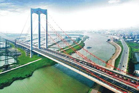杭州江東大橋又稱錢(qián)江九橋,大橋全長(zhǎng)4332.5米,大橋設(shè)計(jì)新穎,其中三跨空間纜自...